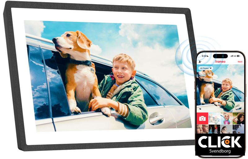 Med den populære Frameo-app (bedømt til 4.9/5 på App Store) kan venner og familie sende billeder og videoer direkte til din ramme – privat og sikkert. Det kræver kun, at rammen er tilsluttet Wi-Fi. Når billederne er uploadet, kan de ses offline, så dine minder altid er tilgængelige.