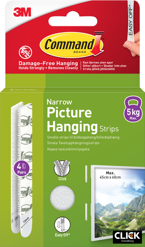 3M Command Strips White Narrow (4 sæt) er den smalle, stærke og diskrete løsning til ophængning af smalle rammer og lette genstande. Ingen huller, ingen søm, ingen klæberester – bare en nem og fleksibel måde at indrette på.