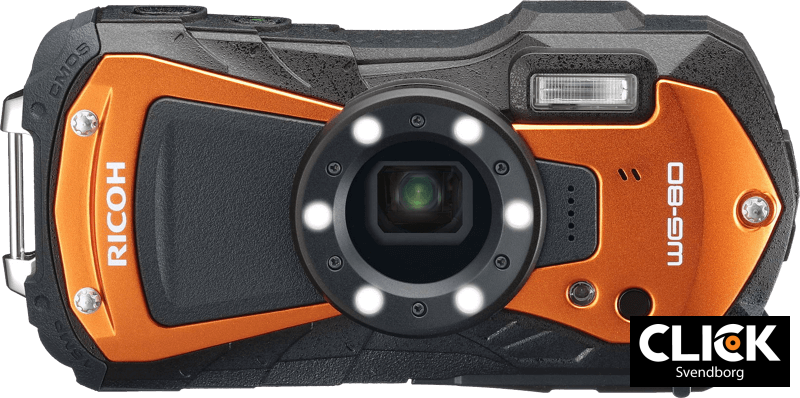 Ricoh WG-80 har et fornyet udvendigt design og forbedret drift. Det leveres med en robust, robust kropskonstruktion og enestående ydeevne. Det er vandtæt op til 14 meter i op til to timer, kuldebestandig til -10 °C og stødsikker til 1,6 m og brudsikker til 100 kg