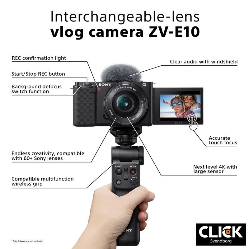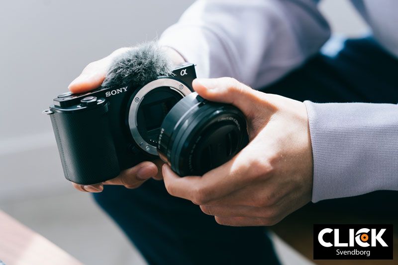 ZV-E10 vejer kun 364 gram og er designet til at være let at håndtere under optagelse. Den vippbare LCD-skærm gør det nemt at tage selfies eller optage fra forskellige vinkler, mens det ergonomiske greb sikrer stabilitet og komfort under længere optagelser.